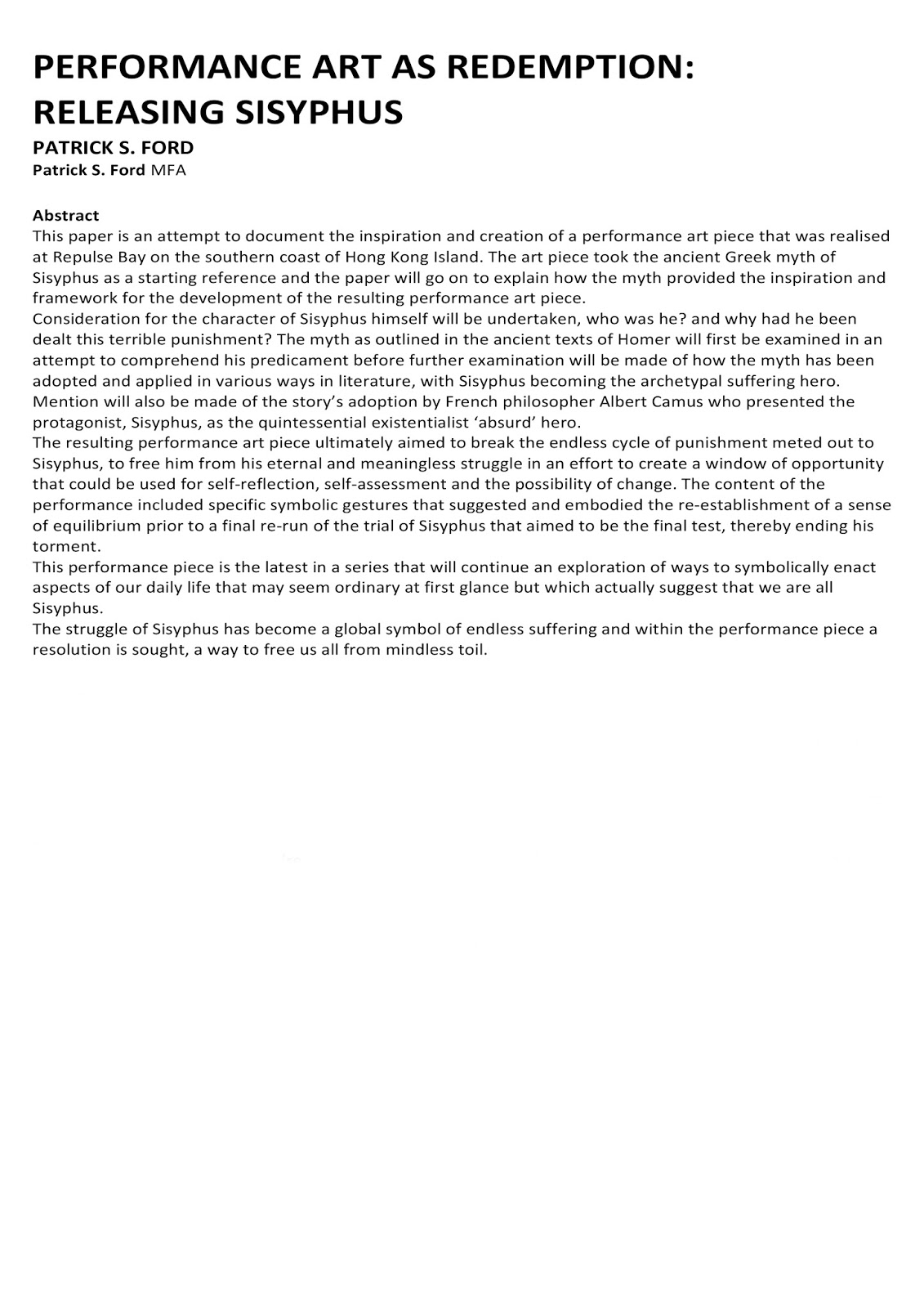 For the 2017 edition of the conference I presented the development of my performance work 'Releasing Sisyphus', which was performed at Repulse Bay on the south of Hong Kong Island on 2nd July 2016. In the paper I examined the myth of Sisyphus, at his character and reflected upon various stories relating to his punishment and the justification for it.