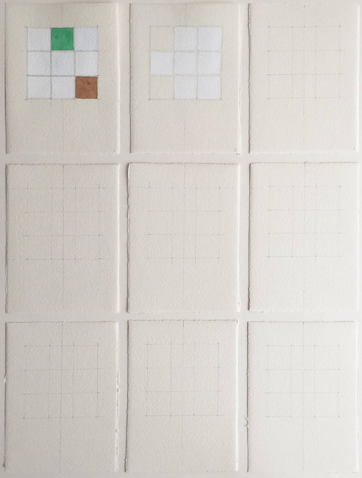 I selected 9 zones of particular interest. The number was important as each zone was itself made up of 9 squares of the background grid. The selected zones are indicated in the notebook page drawing above.