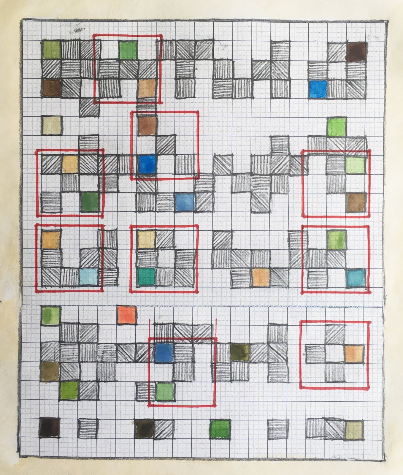 I noticed that the most interesting zones, where colours interacted with shaded blocks in different ways, constituted larger blocks made up of 9 squares as measured on the background grid. Having noticed these interesting zones, the first thing I did was to highlight them and look at them in greater detail.